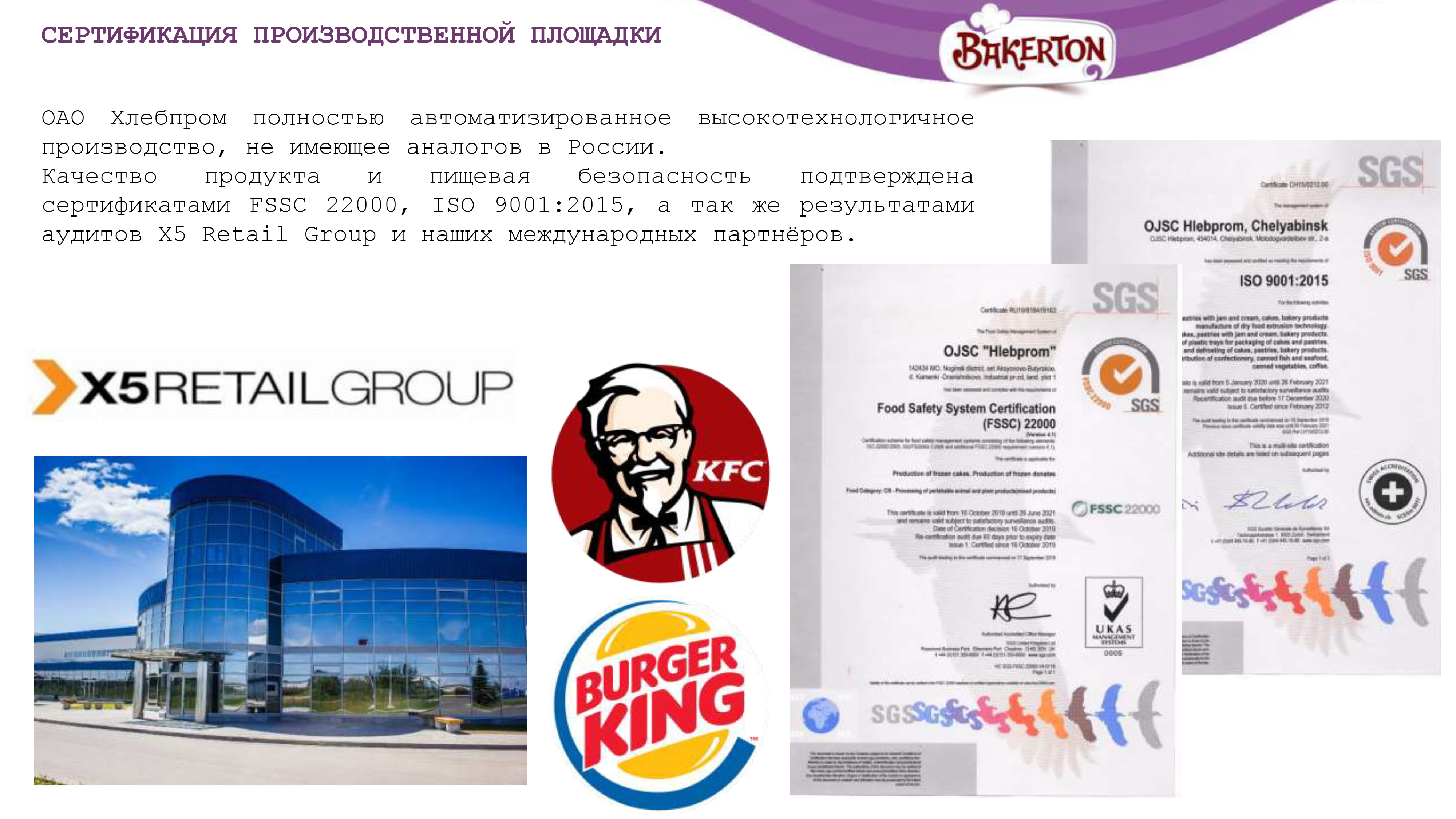Качество продукта и пищевая безопасность подтверждена сертификатами FSSC 22000, ISO 9001:2015, а так же результатами аудитов Х5 Retail Group и наших международных партнёров.